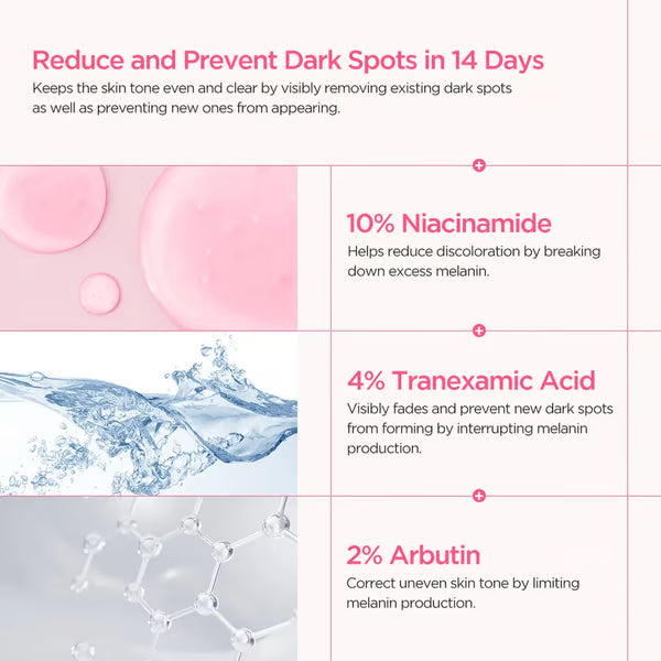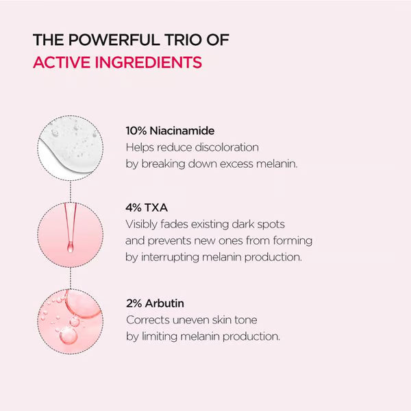 Containing 10% Niacinamide, 4% Tranexamic Acid and 2% Arbutin, a powerful trio of active ingredients to target dull skin, uneven skin tone and enlarged pores.